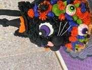 This little black kitty is all decorated for Halloween!!! Looks like it ended getting up eyeballs in it's Halloween scarf!!